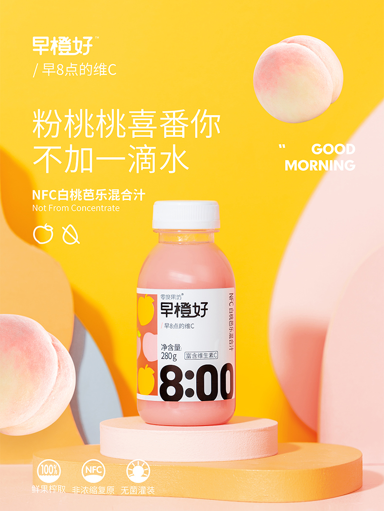 零度果坊早橙好 NFC果汁 白桃芭乐混合汁100%早餐果汁280g*8瓶装